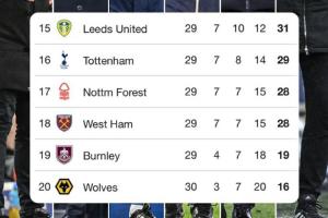 保级区方面,排名第16的热刺29分,只领先第17的森林1分。目前在降级区的三支球队:西汉姆28分(与森林同分),伯恩利19分,狼队16分。