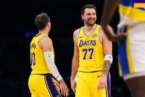 赛后,湖人官方晒出赢球海报,东契奇和肯纳德登上封面。