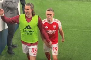 赛后阿森纳球员离场时,卡拉菲奥里兴奋地挥舞手臂,结果不慎击中了特罗萨德的要害部位,后者也捂了捂裆。