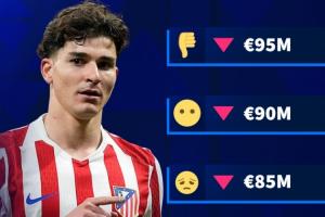 德转给出了阿尔瓦雷斯身价变动的4个可能选项:9500万欧元、9000万欧元、8500万欧元、8000万欧元,目前阿尔瓦雷斯的身价为1亿欧元,这也意味着他的身价一定会迎来下跌。