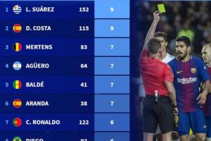 体育资讯03月16日讯 德转盘点前10联赛中,球员在各项赛事假摔染黄次数榜,苏亚雷斯和迭戈·科斯塔9黄并列第一,C罗6黄上榜。