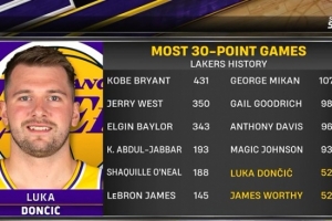 据统计,东契奇已经在湖人52次拿到单场30+,追平名宿沃西,并列队史第11位。