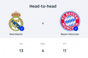 皇马与拜仁在欧冠历史上交手过28次,皇马13胜4平11负占据上风,皇马历史上15次获得欧冠冠军,排列第一;拜仁6次夺冠,排名第三。