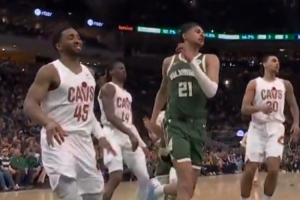雄鹿不敌骑士,比赛中乌斯曼·吉昂在米切尔面前使用后者招牌海底捞大回环,结果脱手出界,米切尔看笑了!