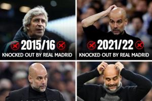 曼城在欧冠淘汰赛与皇马交手7次,被淘汰5次。
