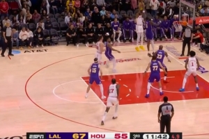 14中13砍下30分!湖人发布赢球海报:封面为詹姆斯上篮瞬间