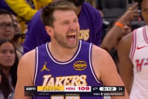 比赛时间走完东契奇投个半场 伊森从替补席助跑一把将球打飞场外