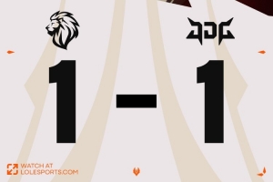 【15:58】JDG上路推进拔掉LYON一塔,随后Dhokla奎桑提自家二塔下被JDG三人越掉,双方经济持平。