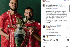 体育资讯3月25日讯 萨拉赫将在本赛季结束后离开利物浦,队友加克波社媒发文致敬。