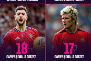 在曼联的英超历史上,只有韦恩·鲁尼(35次)和吉格斯(22次)做到这一点的次数比B费更多,他已经超过了贝克汉姆(17次)。