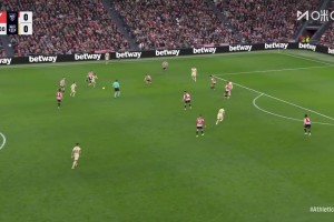 麦卡利斯特头球击中横梁,但这球也冲撞门将犯规在先