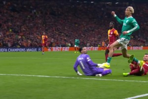 麦卡利斯特头球击中横梁,但这球也冲撞门将犯规在先